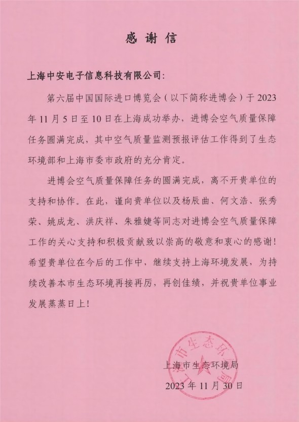 上海市生態(tài)環(huán)境局致上海中安的一封感謝信!(2025-01-10)